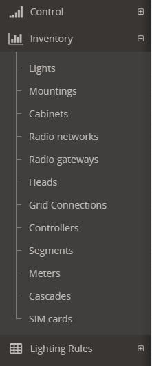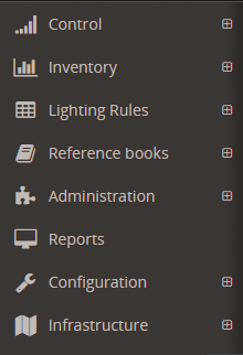 The main menu of the interface is located on the left side of the screen and serves to select the functional sections of the system, such as “Technical accounting”, “Management”, “Administration”, etc. The selected item in the menu is always highlighted in a different color. Before the name of the section, there is an icon designating it (an icon, a symbolic graphic image).