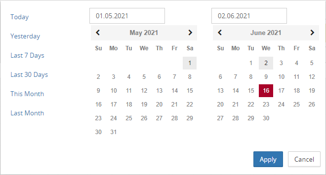 - the Calendar component in the central part of the form allows you to set the date interval with the mouse: