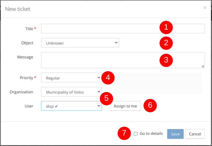 The modal window with required ticket attributes is shown. Enter value at least to mandatory values marked with (*).