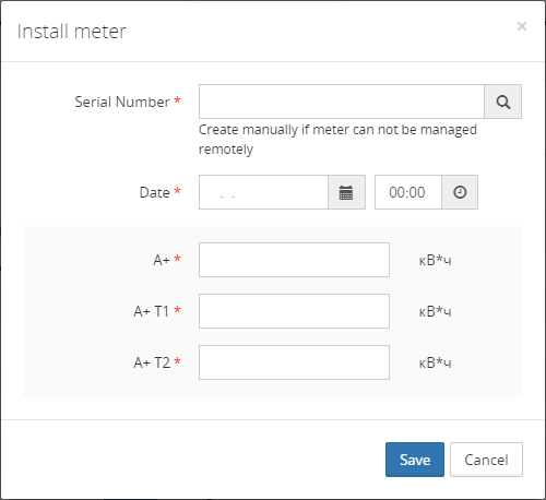 Click the Bind button in the Meter section. A modal window will appear for entering the parameters of the installed meter.