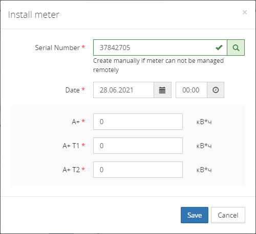 1.1. In the input field “Serial number” start entering the serial number of the meter. The system will prompt the serial numbers of free meters that start with the entered characters.