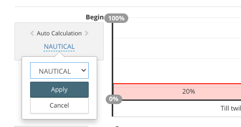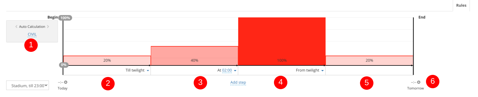 The level 20% states the initial level of dimming, when trigger time (1) reached. Another interval starts when CIVIL twilight ends (Till twilight). The time is calculated automatically based on: day of the year, luminaire geo location, beginning of selected twilight (1)
