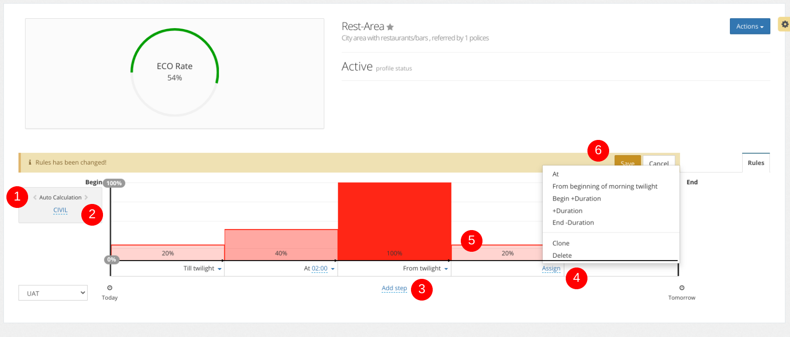 A lighting profile is a logical object, a set of power levels for one luminaire during one period between on and off trigger times specified in the Astronomical Calendar. Created and modified by the specialist. An unlimited number of lighting profiles can be created in the System. From the user’s point of view, the profile looks like a graph of power in the interval from the start time of street lighting to the end time of street lighting. The start and end lighting time are obtained from: