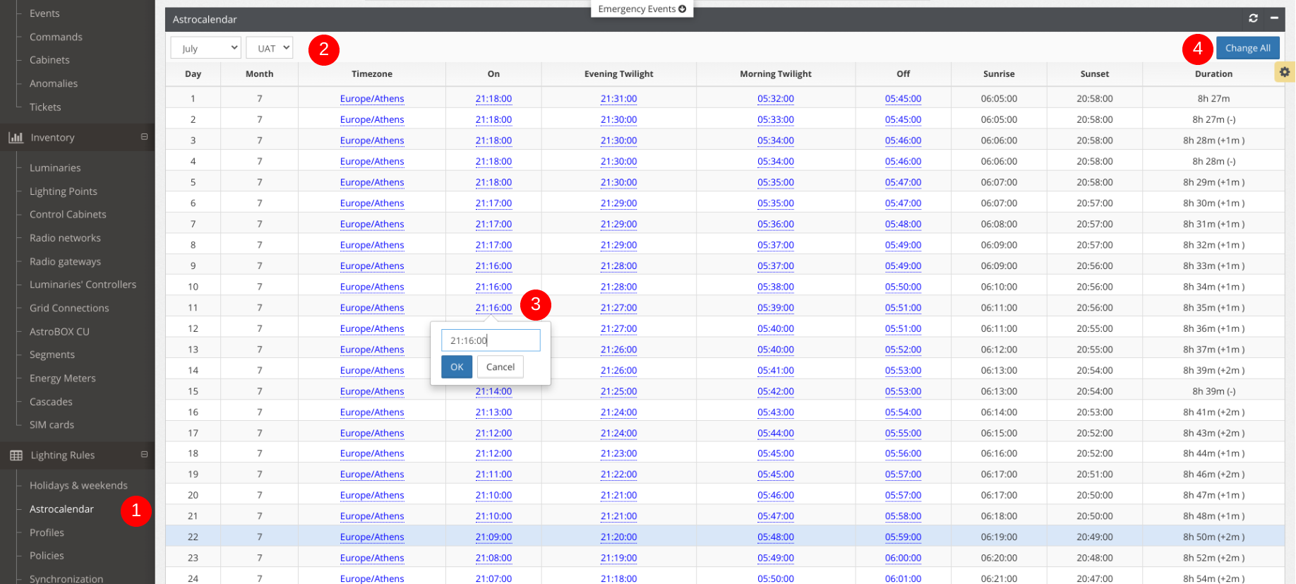 It’s possible to set ON/OFF time later or earlier for every day of the visibly month.