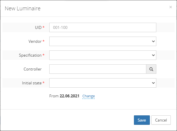 | Initial state | The status assigned to the luminaire upon creation. |