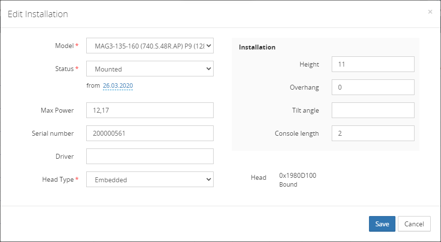 | Status, at | Date of installation of the current state of the luminaire |