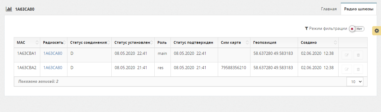 На вкладке Радиошлюзы отображается список радиошлюзов, являющихся основой данной радиосети. Пользователю доступны действия: