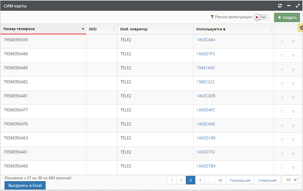 • Редактирование сим карты выполняется по клику на иконку Карандаш;