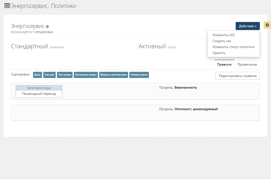 Создание клона политики выполняется заданием нового UID политики в модальном окне Клонировать политику освещения