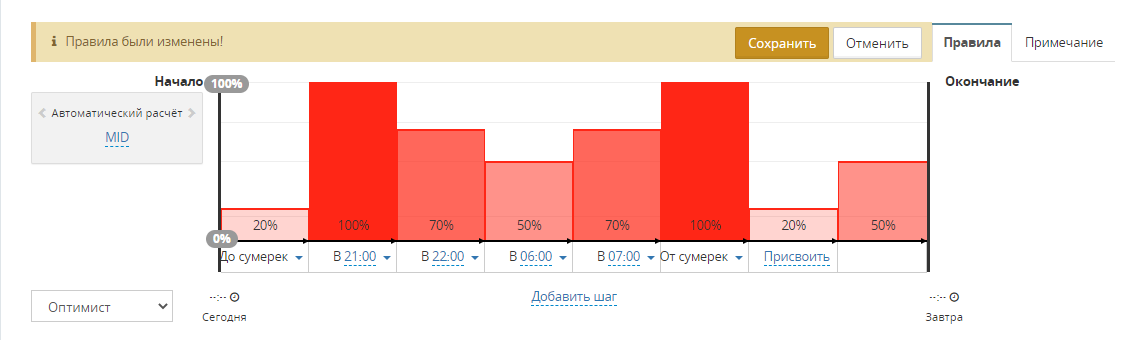 Создания правила димминга выполняется нажатием на кнопку Добавить шаг