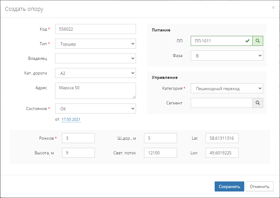 Внешний вид модального окна изменения характеристик опоры, аналогичен окну создания (см. выше).