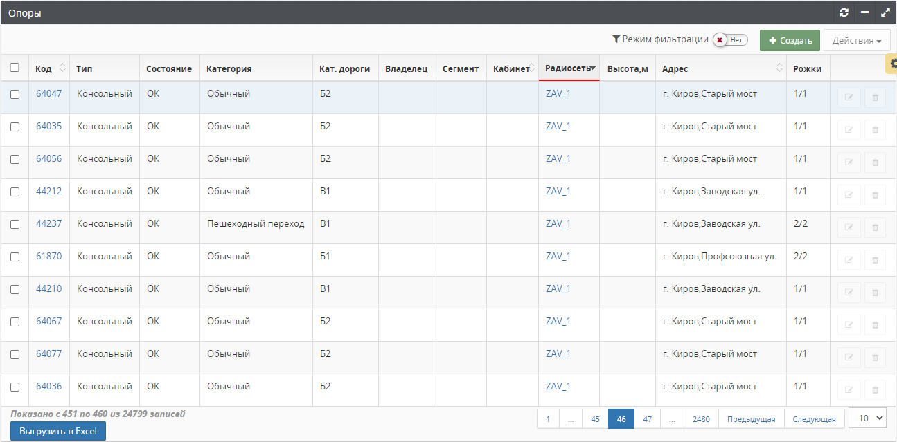 Внешний вид списка Опоры при наличии всех прав доступа.